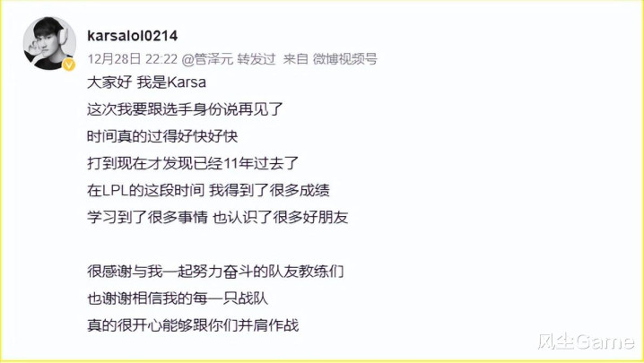 昨年打进巨匠总决的咖哥,近日郑重官宣退役,处事生计就此告一段落,神不知,鬼不觉,咖哥王人打了11年的处事了,诚然末期口碑稍许下滑,但他的巅峰期,如实没的说,服从闪电狼的本事,寰宇赛屡次带队打败LCK军队,转战LPL之后,联赛冠军、MSI冠军王人拿过,况兼还从RNG全身而退。