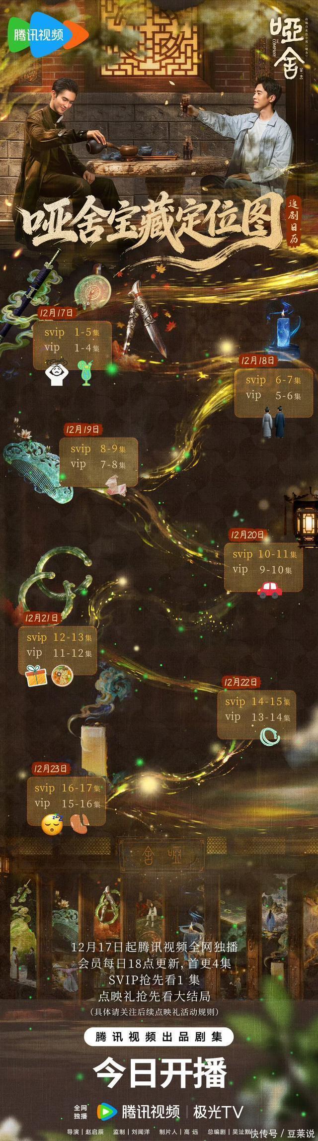 ★《哑舍》开播 改编自黑色同名演义,由高伟光、梁靖康、张淼怡、毛晓慧主演的魔幻穿越剧《哑舍》将于12月17日今晚18:00登陆腾讯视频开播,首更4+1集。 该剧暴露来自明天的古董店雇主毕之(高伟光饰)和当代宠物大夫苏北陆(梁靖康饰)通过古董店哑舍的时空之门,寻找洒落在历史长河中的古董,了解每件古董背后承载的奥妙与合手念的故事。
