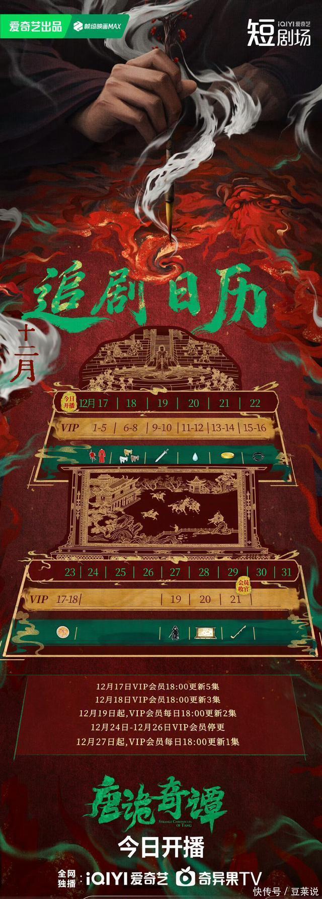 ★《唐诡奇谭》开播 长信传媒制作,《唐朝诡事录》系列剧集,由杨旭文、杨志刚主演的的古装探案剧《唐诡奇谭》将于12月17日今晚18:00起登陆爱奇艺短戏院开播,首更5集。 该剧暴露以卢凌风(杨旭文饰)、苏无名(杨志刚饰)为首的探案小队在长安造访“解忧店”、“眚宫歌”两个单位案件真相的故事。