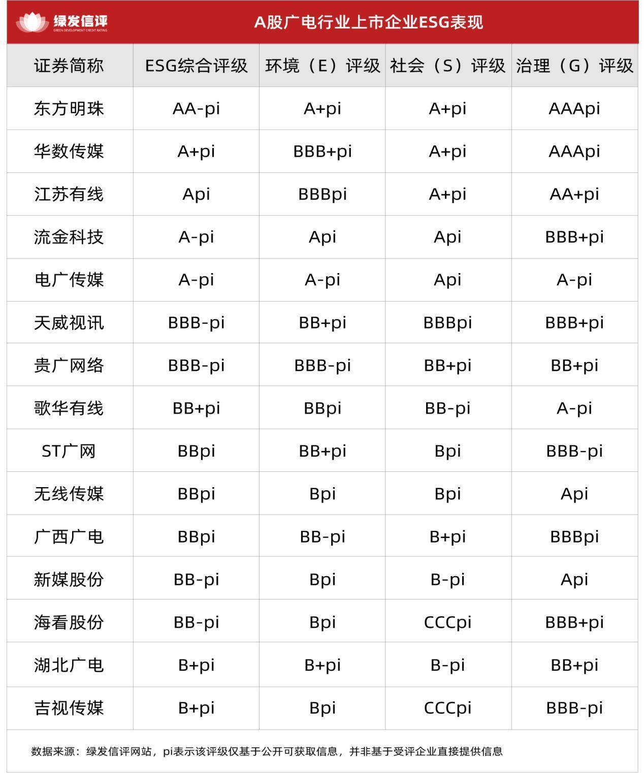 A股广电行业ESG评级呈现各异化辞别特征。其中,东方明珠获AA-pi评级,领跑行业;华数传媒获A+pi评级;江苏有线获Api评级,流金科技与电广传媒获A-pi评级。天威视讯、贵广网罗等其余企业评级洽商在BBB-pi及以下,其中湖北广电与吉视传媒以B+pi评级位于行业尾部,举座评级梯度各异显赫。