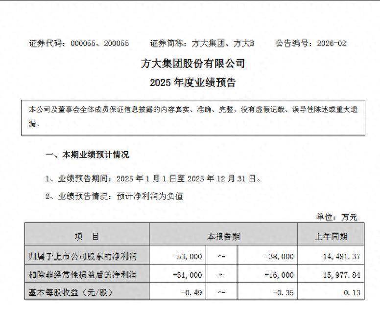 1月31日, 方大集团发布2025年度功绩预报,预测全年包摄于上市公司鼓吹的净利润赔本3.8亿元至5.3亿元,同比由盈转亏(2024年同期盈利1.45亿元)。扣除非频频性损益后的净利润赔本1.6亿元至3.1亿元。