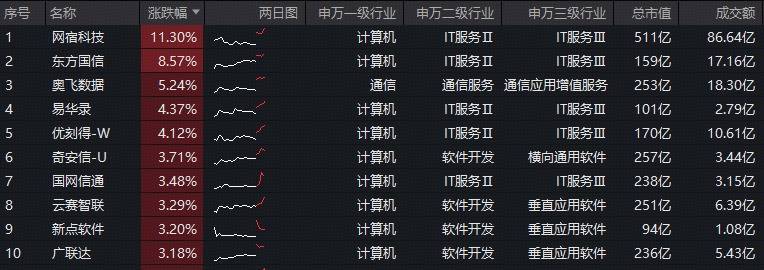 成份股方面,网宿科技领涨超11%,东方国信涨逾8%,奥飞数据、易华录、优刻得涨超4%,奇安信、国网信通等个股跟涨。